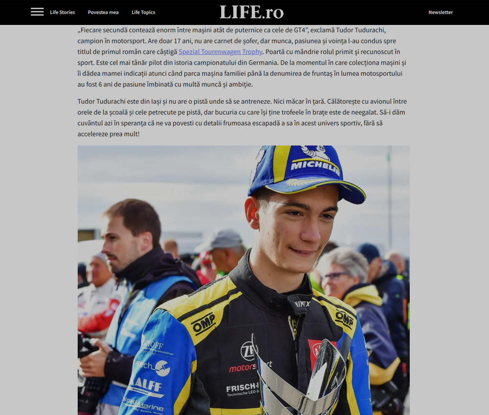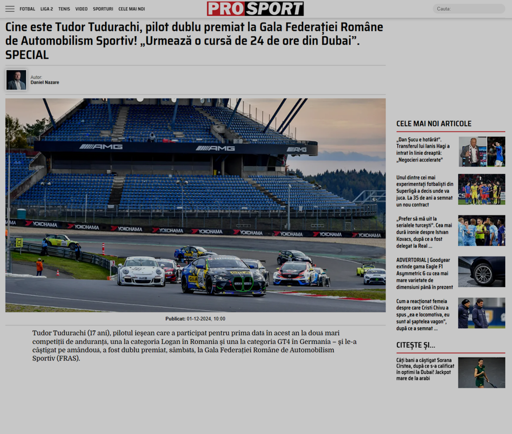 Echipa e totul în curse, chiar dacă pe podium se vede doar pilotul. În 2024 am participat la campionate de anduranță în România – Logan Cup – și în Germania – Spezial Tourenwagen Trophy –, câștigându-le pe ambele. În Germania am fost, la doar 16 ani, cel mai tânăr pilot din istoria competiției.